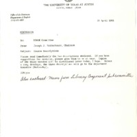 A memo introducing documents submitted for English Department approval or information: Descriptions of E 346K (Writing in the Arts and Humanities, Writing in Natural Sciences and Technology, Writing in Behavioral and Social Sciences); a memo from Michael King about library resources that might be available for E 346K instruction